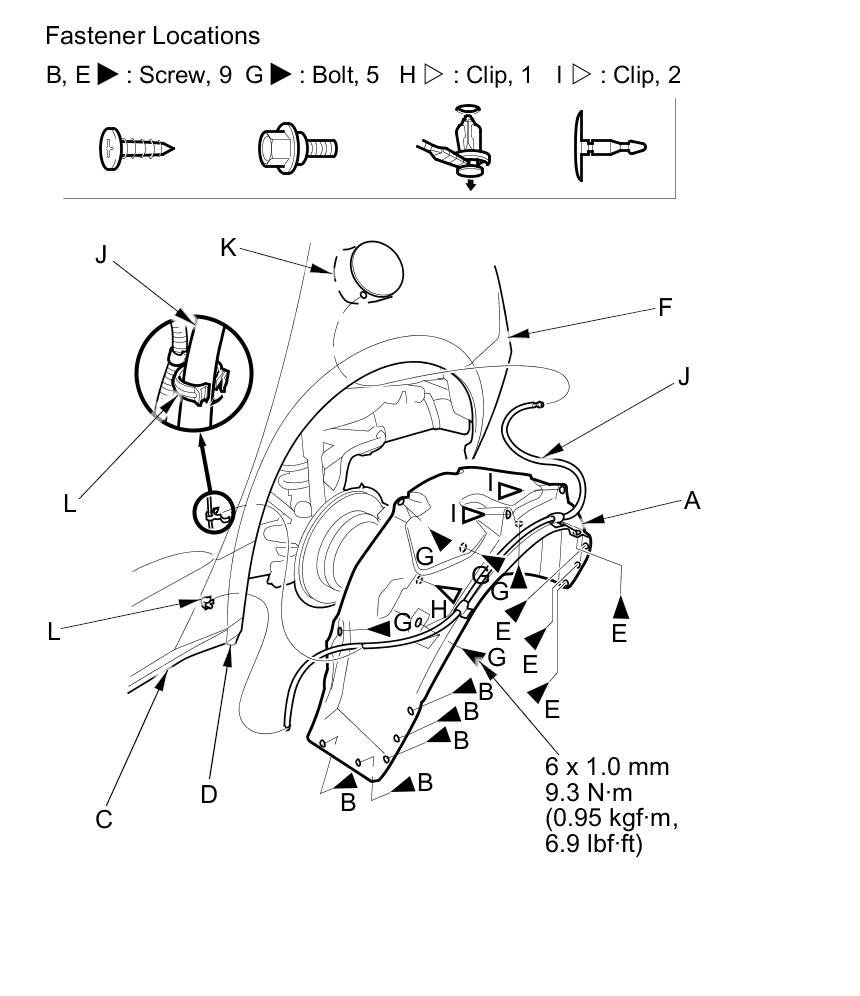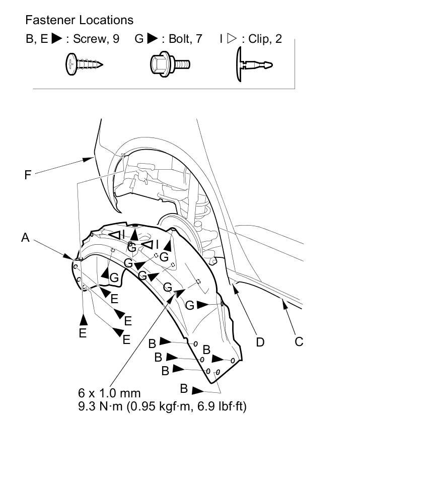3. From the rear wheel arch, remove the bolts (G) and detach the clips (H, I).
