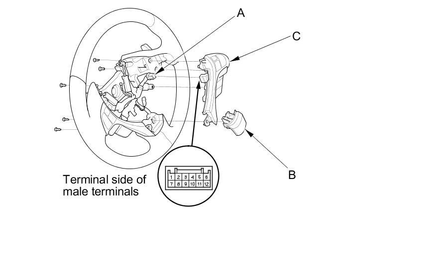 2. Disconnect the cable real subharness connector (A) and the steering wheel center trim (B), then remove the steering wheel trim/cruise control combination switch (C).