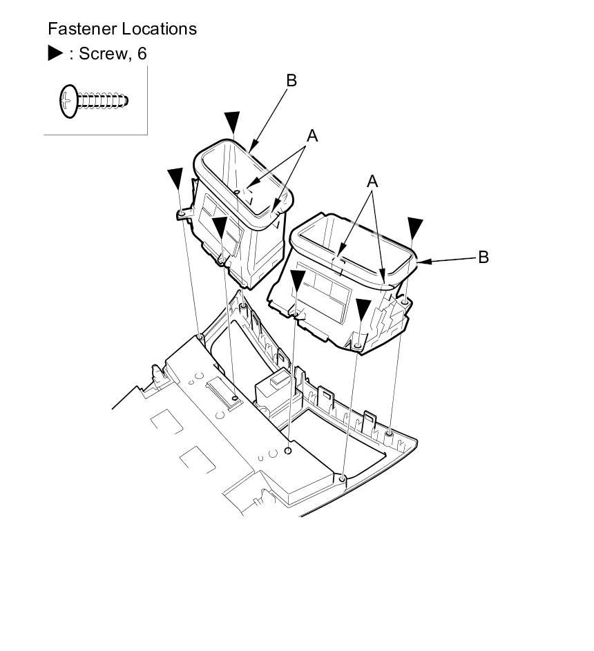 2. From back of the switch panel, remove the screws, and release the hooks (A), then remove the center vents (B).