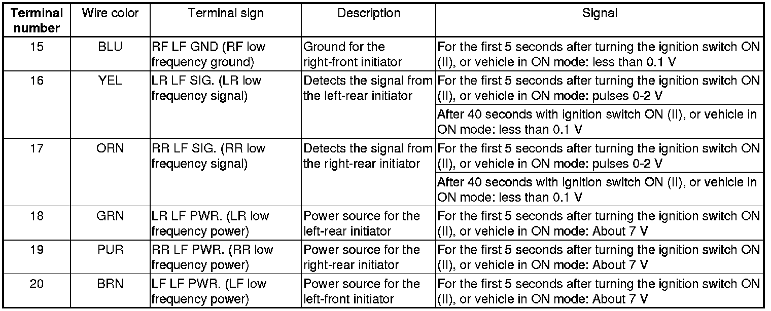 TPMS Control Unit Inputs and Outputs for 20P Connector (cont'd)