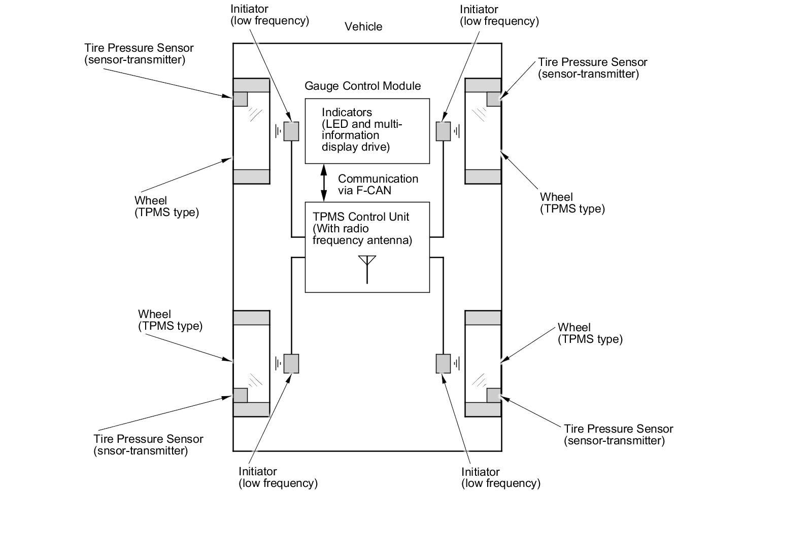 All indicators are in the gauge control module: The low tire pressure indicator (LED indicator), the four tire indicators (on the multi-information display) to show which tire is affected, and the TPMS indicator (on the multi-information display) that comes on only if there is a problem with the system. The message indicator (LED indicator) comes on when there is one or more indicators on in the multi-information display. When two or more tire pressures are low, the low tire pressure indicator comes on about 5 seconds before the appropriate tire indicator. Once low pressure is detected, the system scans all four tire pressure sensors to ensure that it turns on the correct tire indicator.