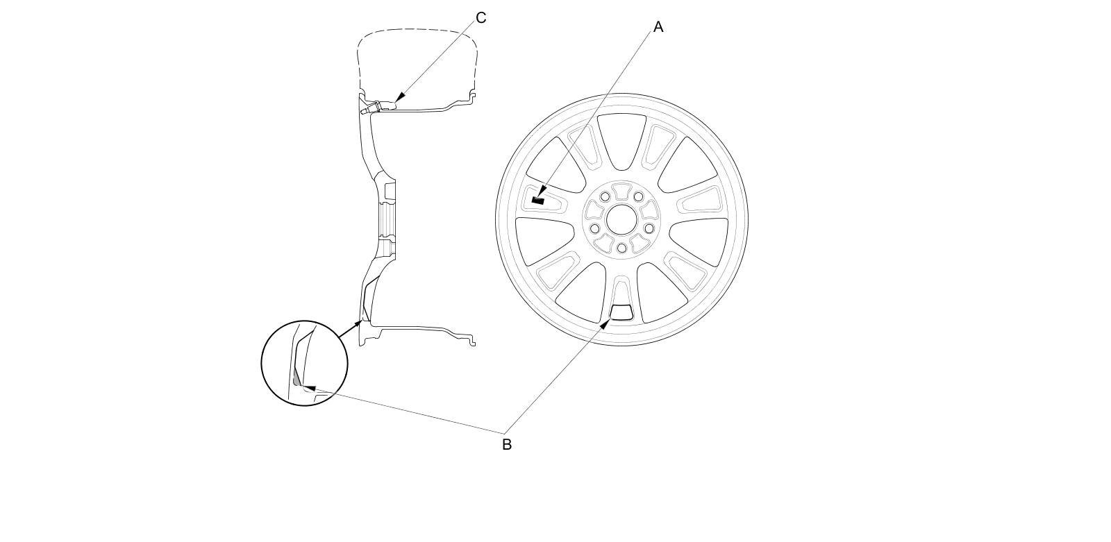 The TPMS will not work unless TPMS type wheels are installed on the vehicle. The original equipment wheels have a "TPMS" mark (A) on them, and are counterweighted (B) by adding material on the opposite side of the tire pressure sensor (C), to counterbalance the weight of the sensor.