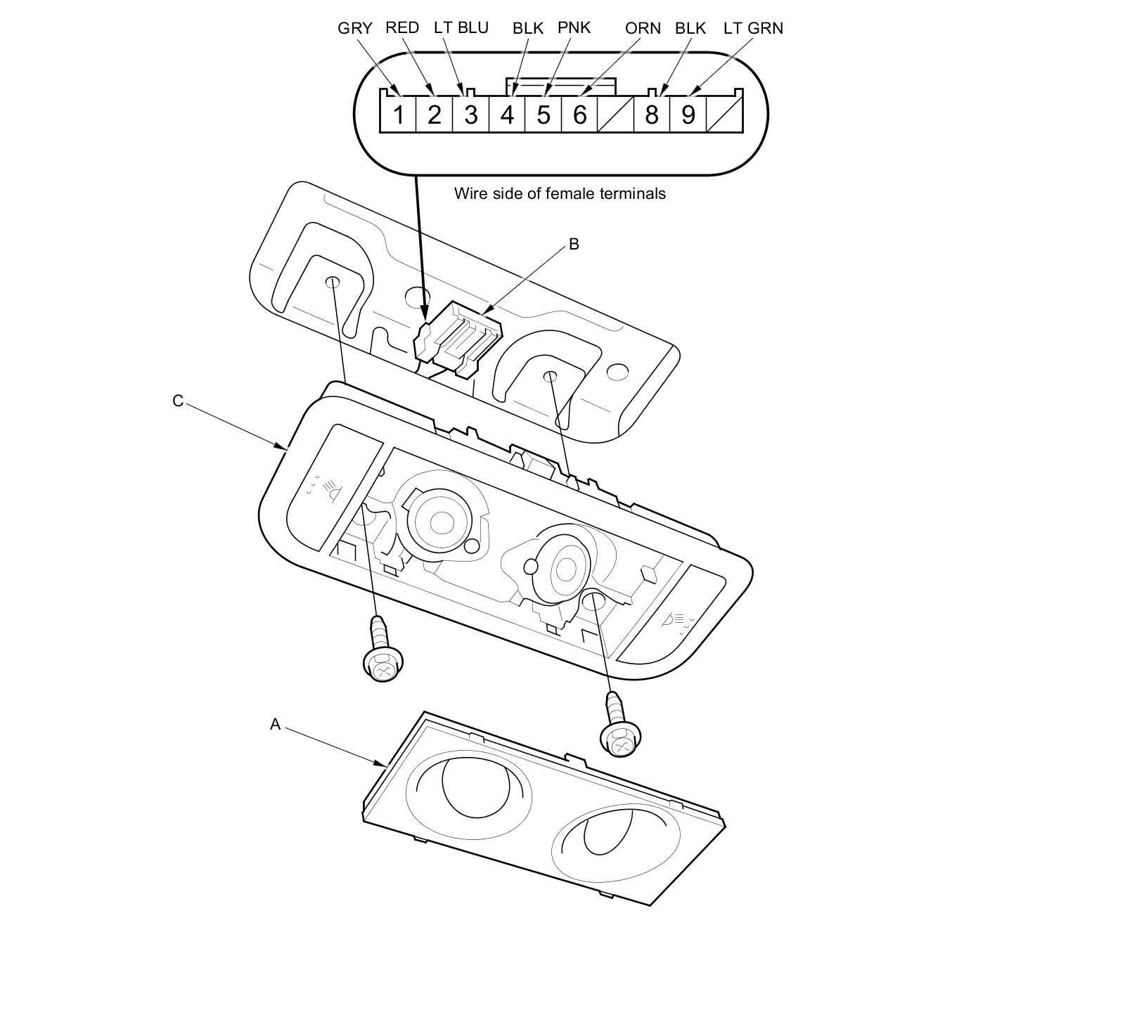 3. Disconnect the 10P connector (B) from the rear individual map light (C).