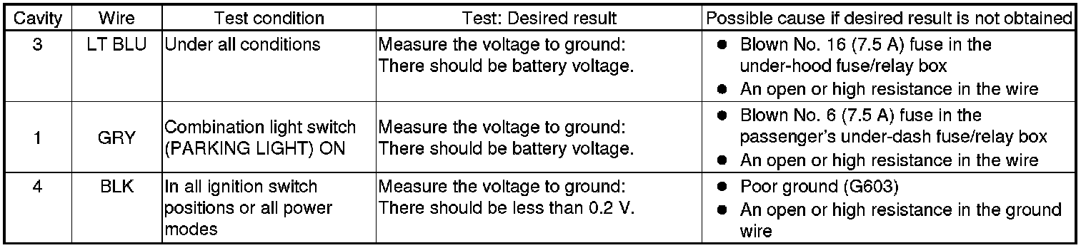 6. Reconnect the connector to the rear individual map light, and do the following input tests: