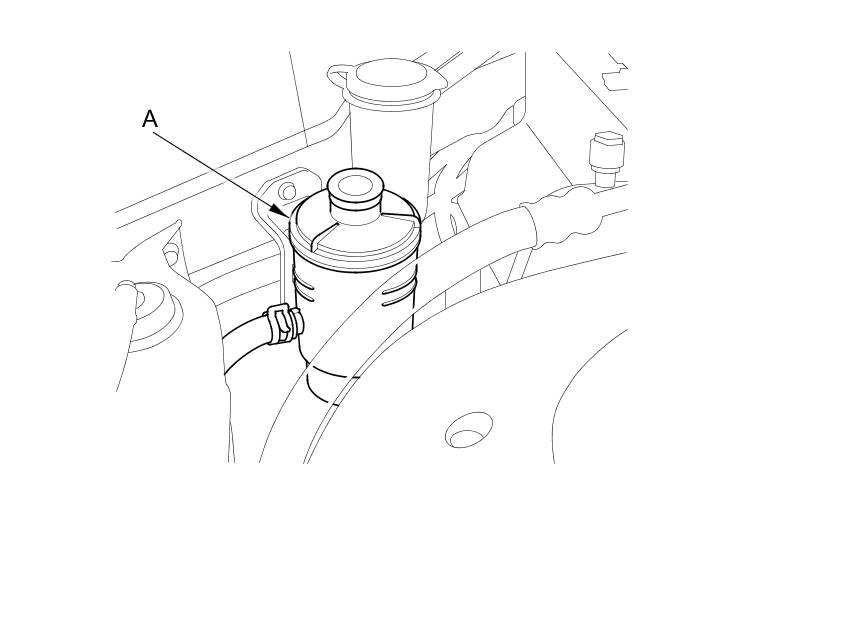 2. Disconnect the return hose (A) to drain the reservoir. Take care not to spill the fluid on the vehicle. Wipe off any spilled fluid at once.