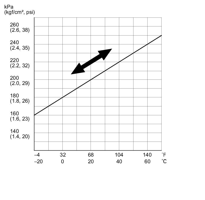 Tire pressures increase slightly as the temperature in the tires rises during driving. Pressures can also increase or decrease slightly with changes in outside air temperature. A temperature change of about 18 °F(10 °C) changes tire pressure by about 10 kPa(0.1 kgf/cm2, 1.5 psi). If the temperature drops, tire pressure could decrease enough to turn on the low tire pressure indicator and tire indicator(s), but later, the tire temperature could increase enough to turn the indicator off. To resolve a complaint of such intermittent indications, confirm and clear the stored DTC(s) and check the tire pressures. Then explain to the client how temperature changes can affect the system.