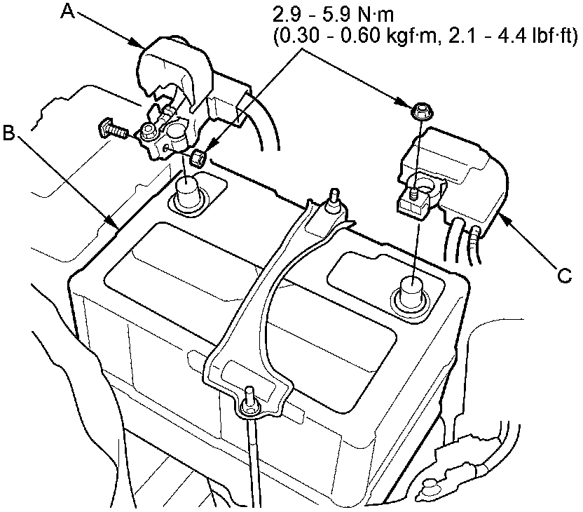 3. Reconnect the positive cable (A) to the battery (B) first, then reconnect the negative cable (C) to the battery.