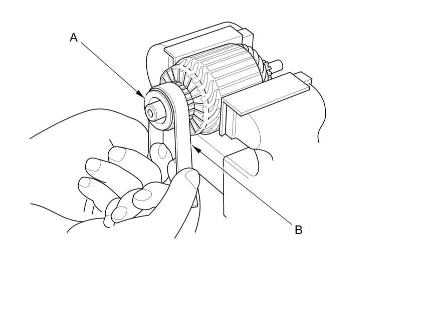 6. Check the commutator (A) surface. If the surface is dirty or burnt, resurface it with an emery cloth or a lathe to the specifications in step 7, or recondition with #500 or #600 sandpaper (B).