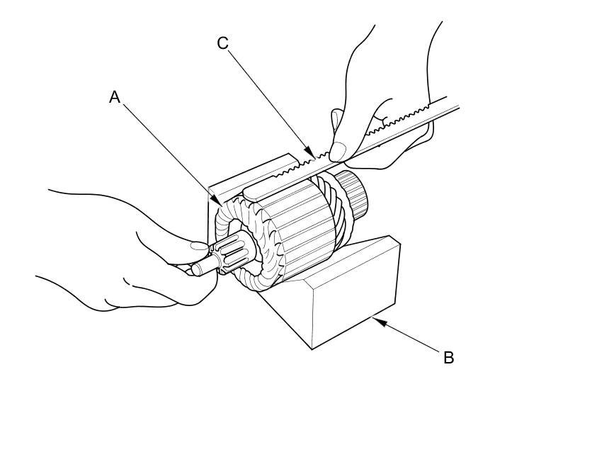 11. Place the armature (A) on an armature tester (B). Hold a hacksaw blade (C) on the armature core. If the blade is attracted to the core while the core is turned, the armature is shorted. Replace the armature.