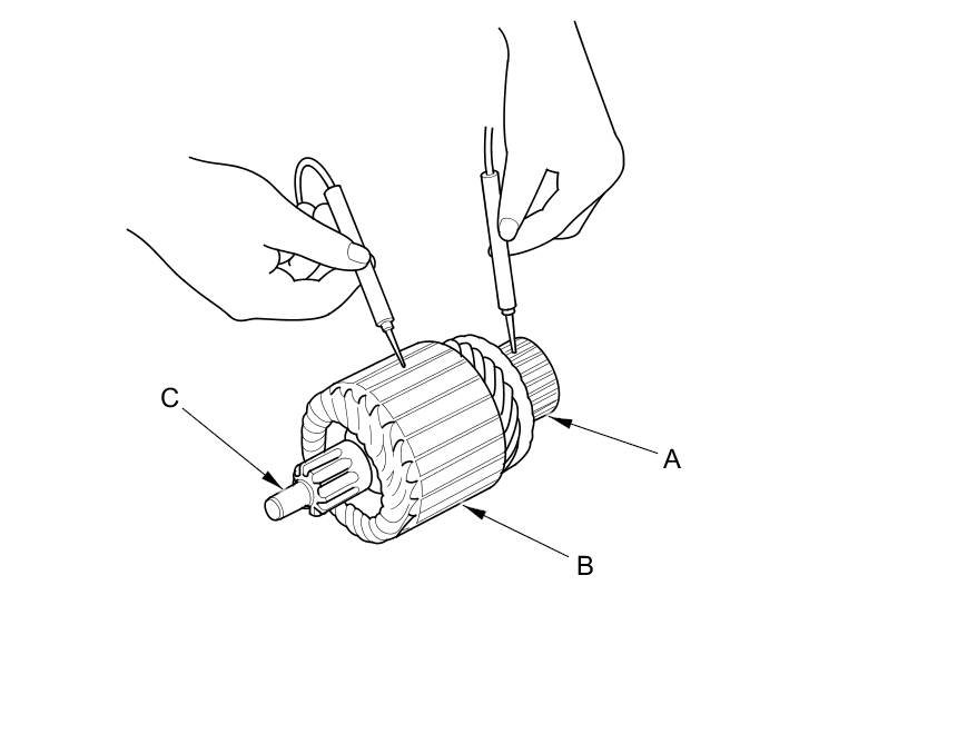 12. Use an ohmmeter to check for continuity between the commutator (A) and the armature coil core (B), and between the commutator and the armature shaft (C). If there is continuity, replace the armature.