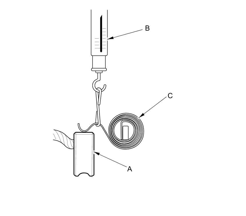 18. Insert the brush (A) into the brush holder, and bring the brush into contact with the commutator, then attach a spring scale (B) to the spring (C). Measure the spring tension at the moment the spring lifts off the brush. If it is not within the standard, replace the brush holder assembly.