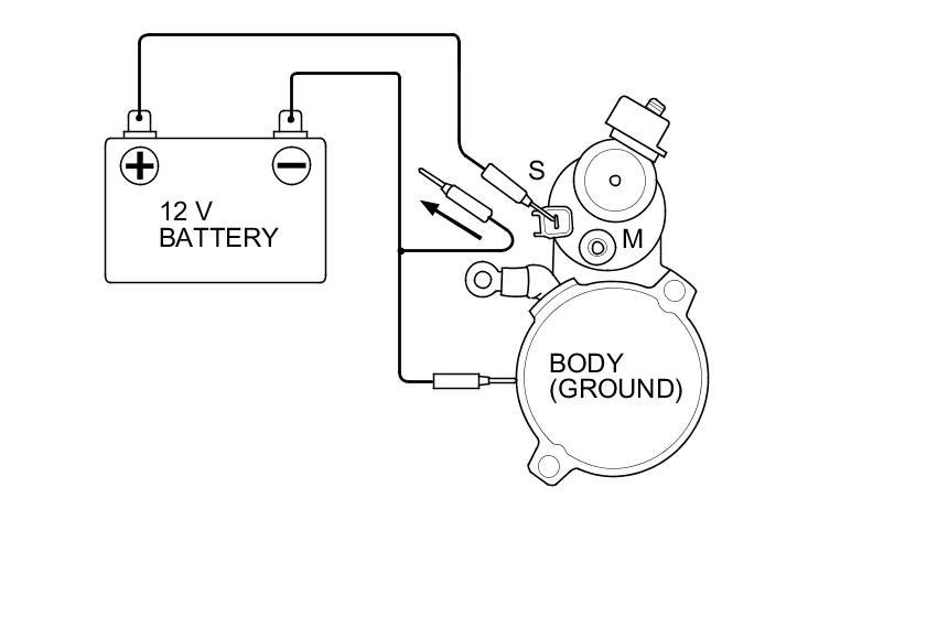 5. Connect the battery as shown. Make sure you disconnect the starter motor wire from the M terminal. If the starter pinion moves out, it is working properly.