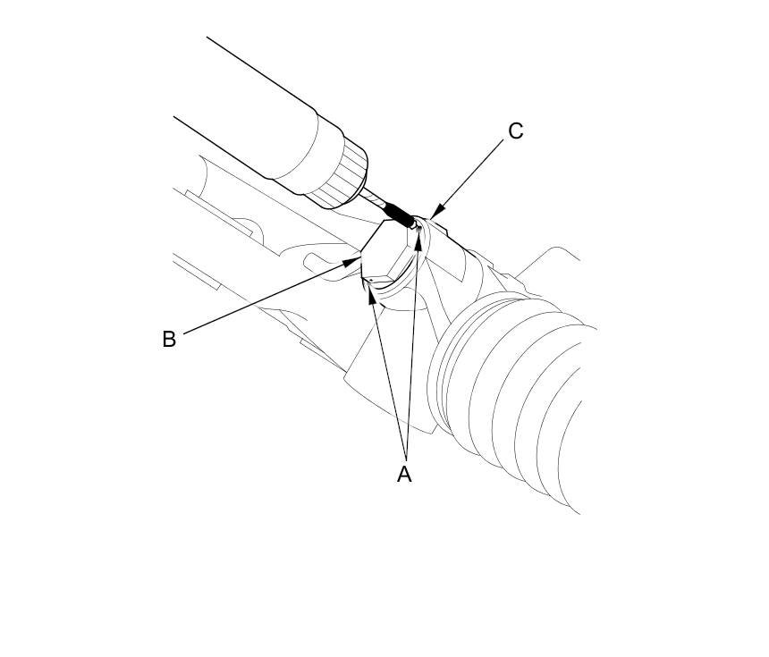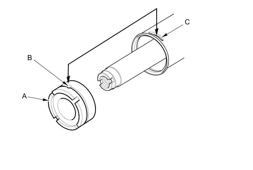 43. Install the rack stop (A) onto the steering rack so the hole (B) is aligned with the slot (C) on the cylinder housing.