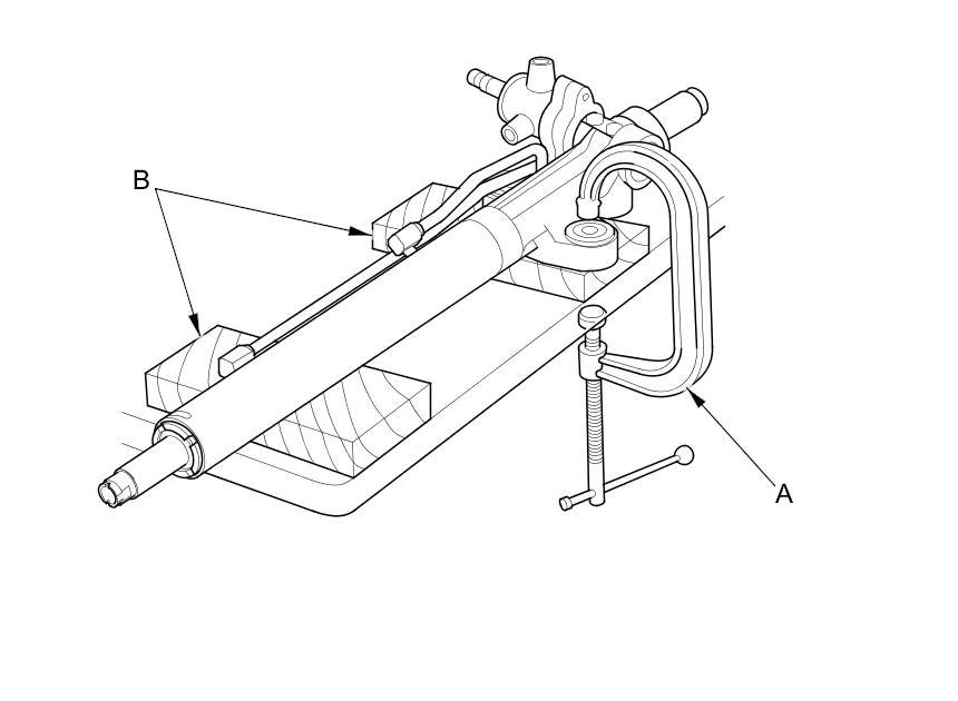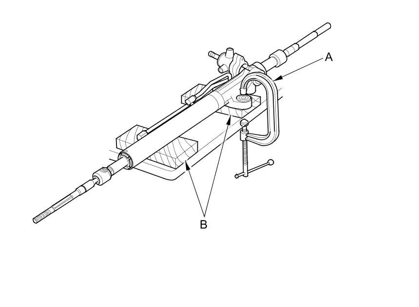 8. Hold the flat surface sections (A) of the steering rack (B) with one wrench, and unscrew rack end (C) with another wrench. Be careful not to damage the rack surface with the wrench.