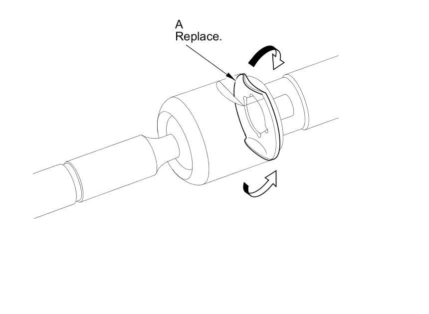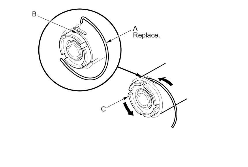 44. Insert the end of the new circlip (A) into the hole (B) of the rack stop (C). Turn the rack stop counterclockwise until the circlip is fully seated in the rack stop.