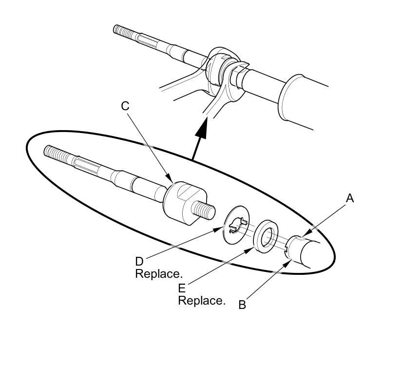58. Install a new rubber stop (A) and a new lock washer (B). Align the lock washer tabs (C) with the slots (D) on the rack end (E) while holding the lock washer in place.