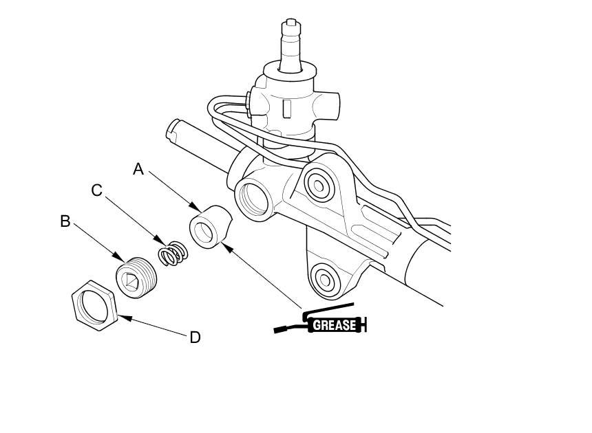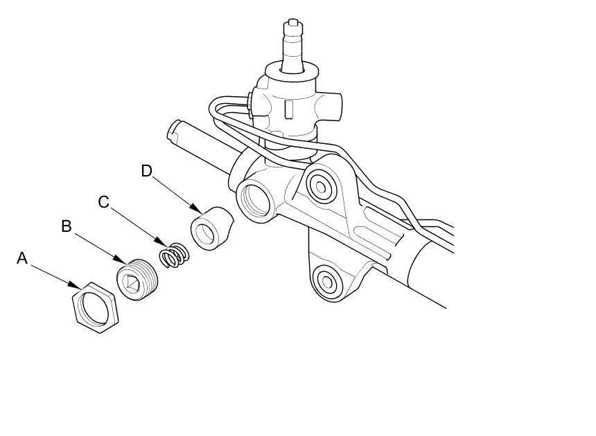 55. Remove the old sealant from the rack guide screw (B), and apply new sealant (Loctite 565) to the middle of the threads of the rack guide screw, then install the spring (C), rack guide screw, and locknut (D).
