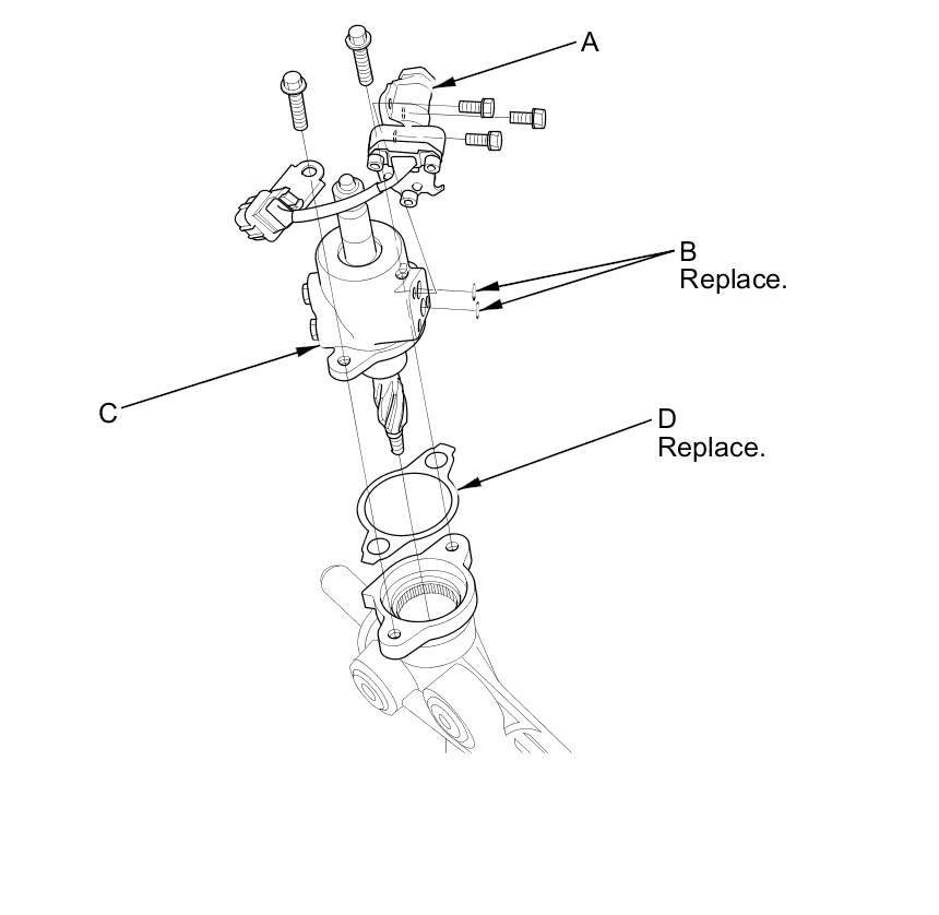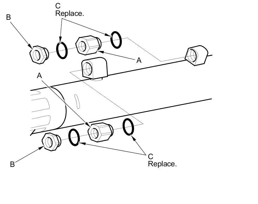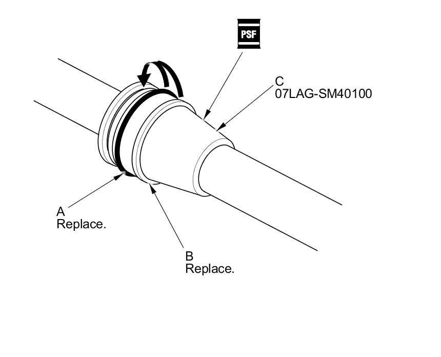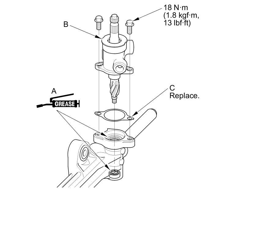 13. Remove the connector A, the connector B, and the O-rings (C) from the steering gearbox.