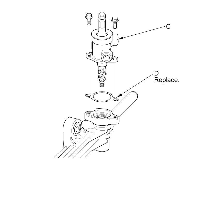 16. Remove the flange bolts, the valve body unit (C), and gasket (D) from the gearbox housing. Check that the valve turns smoothly by turning the pinion shaft. If any play or roughness is felt, replace the valve body unit with a new part.
