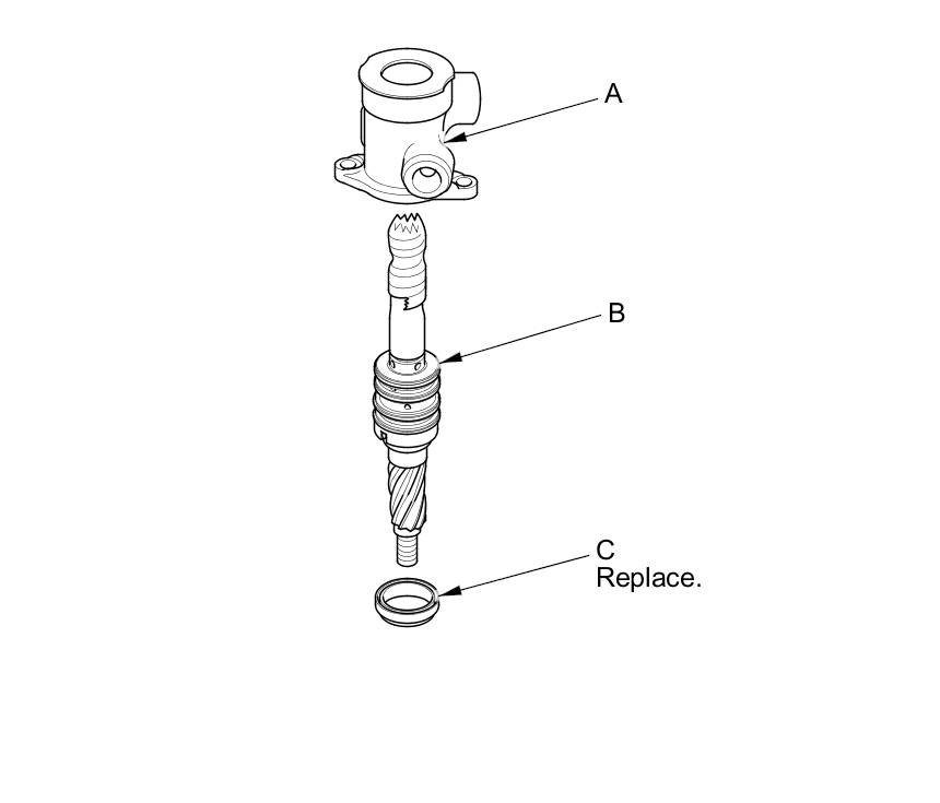 18. Separate the valve housing (A) from the pinion shaft/sleeve (B) and valve oil seal (C).