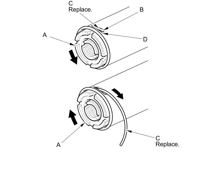 19. Turn the rack stop (A) counterclockwise until the end (B) of the circlip (C) sticks out from the hole (D) in the cylinder housing. Then turn it clockwise to remove the circlip.