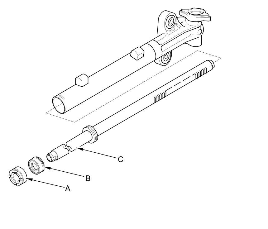 20. Remove the rack stop (A), rack bushing (B), and steering rack (C) from the steering gearbox.
