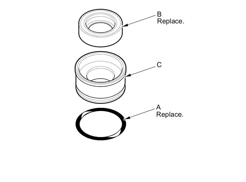 21. Remove the O-ring (A) and cylinder end seal (B) from the rack bushing (C).