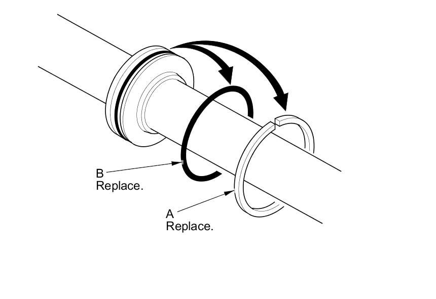 22. Carefully pry the piston seal ring (A) and O-ring (B) off the rack piston. Be careful not to damage the inside of the seal ring groove and piston edges when removing the seal ring.