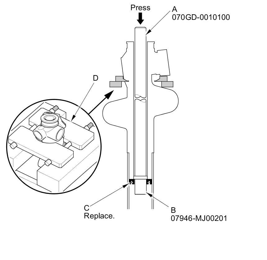 24. Install the bearing separator (D) on the gearbox housing. Set the steering gearbox in a press so the gearbox housing points upward, then push out the cylinder end seal by pressing on the end of the driver handle and driver head.