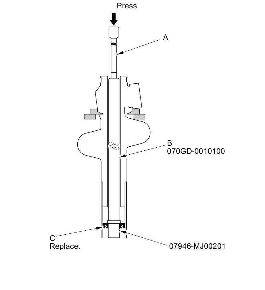 25. Remove the steering gearbox from the press, and set a driver extension (A) on the driver handle (B). Place the steering gearbox in a press, then remove the cylinder end seal (C) from the gearbox housing by pressing on the end of the extension.