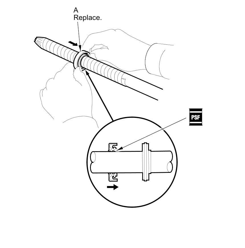 32. Coat the inside surface of the new cylinder end seal (A) with power steering fluid, then install it onto the steering rack with its grooved side toward the piston. When installing the cylinder end seal, be careful not to damage the lip of the seal with the edges or teeth of the steering rack.