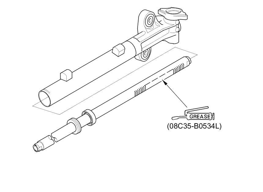 34. Apply steering grease to the steering rack teeth, then insert the steering rack into the gearbox housing. Be careful not to damage the inner surface of the cylinder wall with the rack edges.