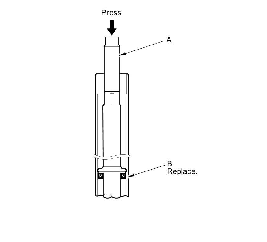 36. Install the new cylinder end seal (B) into the bottom of the cylinder by pressing on the tool with a press. Do not push on the tool with excessive force as it may damage the cylinder end seal.