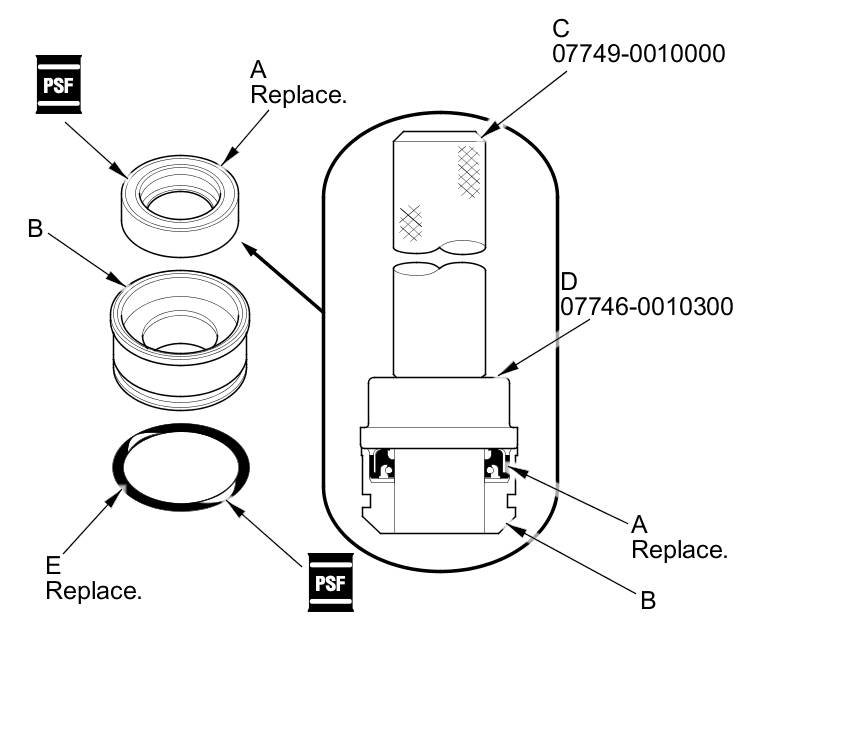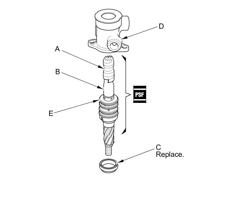 46. Insert the pinion shaft/sleeve and a new valve oil seal (C) into the valve housing (D). Be careful not to damage the valve seal rings (E).