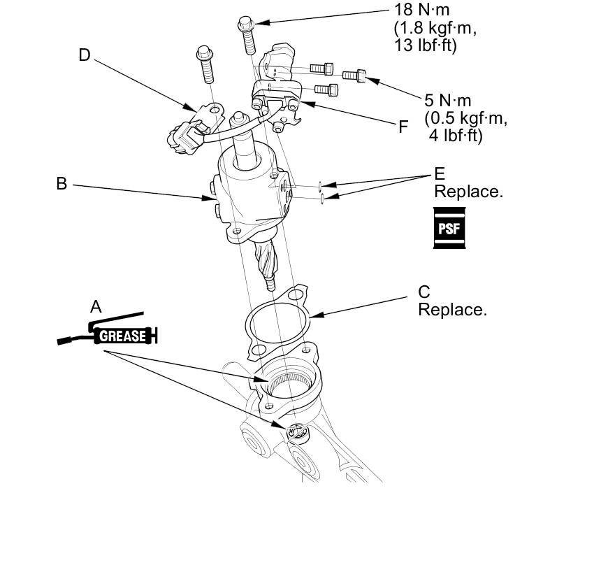 50. With ECPS: Coat the new O-rings (E) with power steering fluid, then install the O-rings and the ECPS valve motor (F).