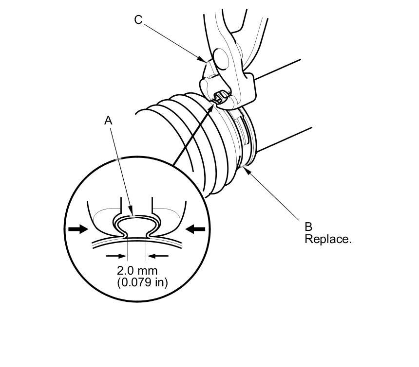 70. Close the ear portion (A) of the boot band (B) with commercially available pincers Oetiker 1098 (C) or equivalent.