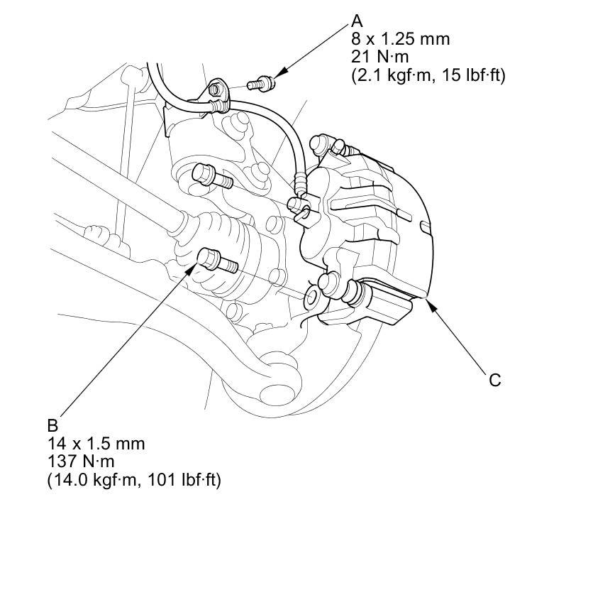 4. Remove the brake caliper bracket mounting bolts (B), then remove the caliper assembly (C) from the knuckle. To prevent damage to the caliper assembly or brake hose, use a short piece of wire to hang the caliper assembly from the undercarriage. Do not twist the brake hose excessively.