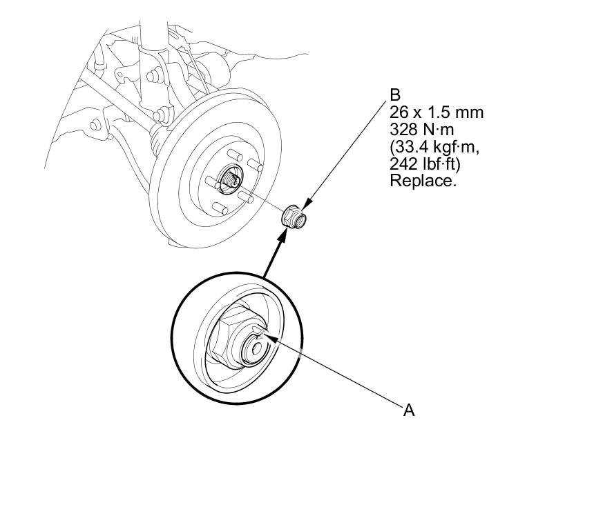 - Before installing the spindle nut, apply a small amount of engine oil to the seating surface of the nut. After tightening, use a drift to stake the spindle nut shoulder against the driveshaft.