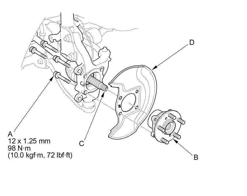 7. Remove the flange bolts (A), and remove the hub bearing unit (B) by tapping the driveshaft end (C) with a soft face hammer while drawing the hub bearing unit outward, then remove the splash guard (D).