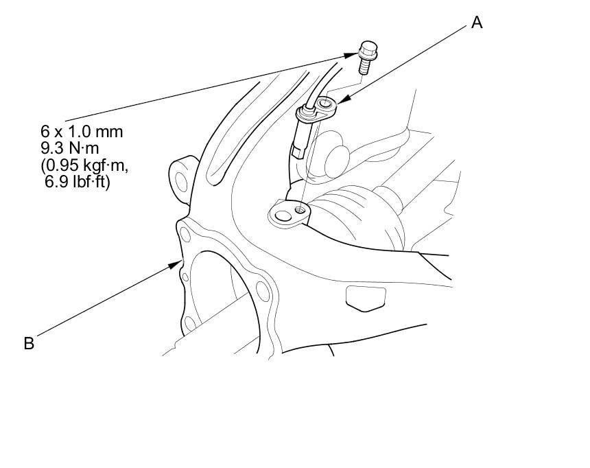 2. Remove the wheel speed sensor (A) from the knuckle (B). Do not disconnect the wheel speed sensor connector.