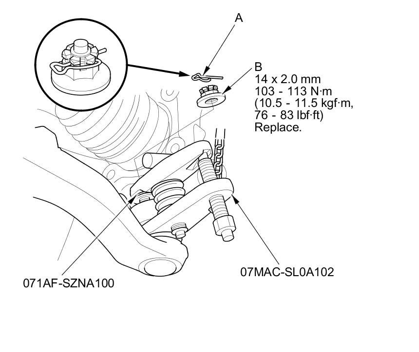 5. Remove the lock pin (A) from the lower arm ball joint, then remove the castle nut (B).