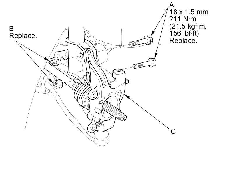 7. Remove the damper pinch bolts (A) and flange nuts (B) from the damper, then remove the knuckle (C).