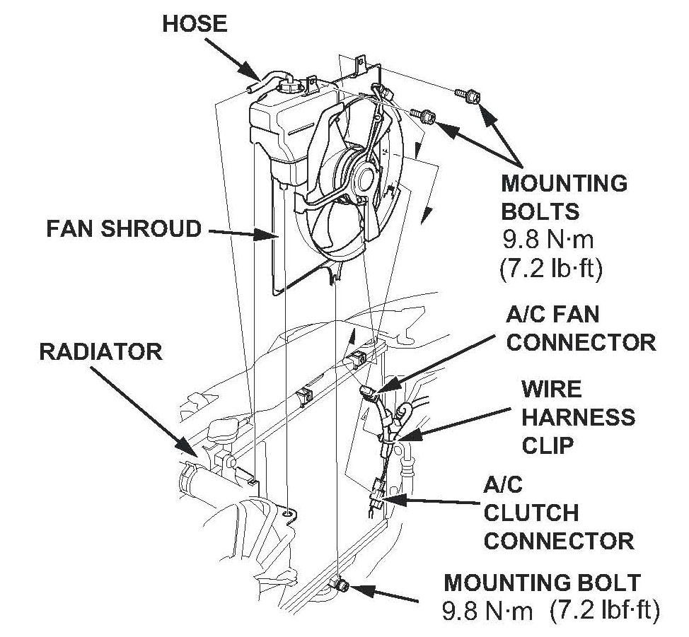 ^ Remove the coolant reservoir, then remove the A/C condenser fan shroud assembly.