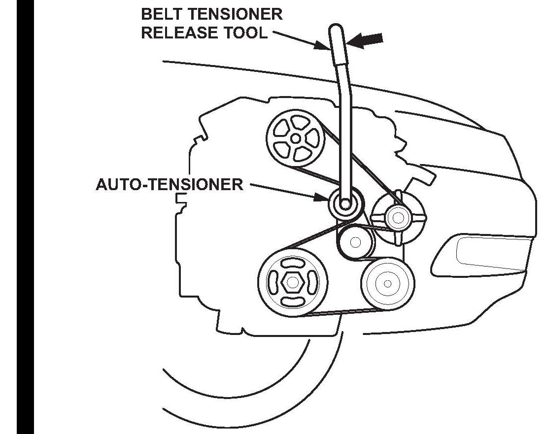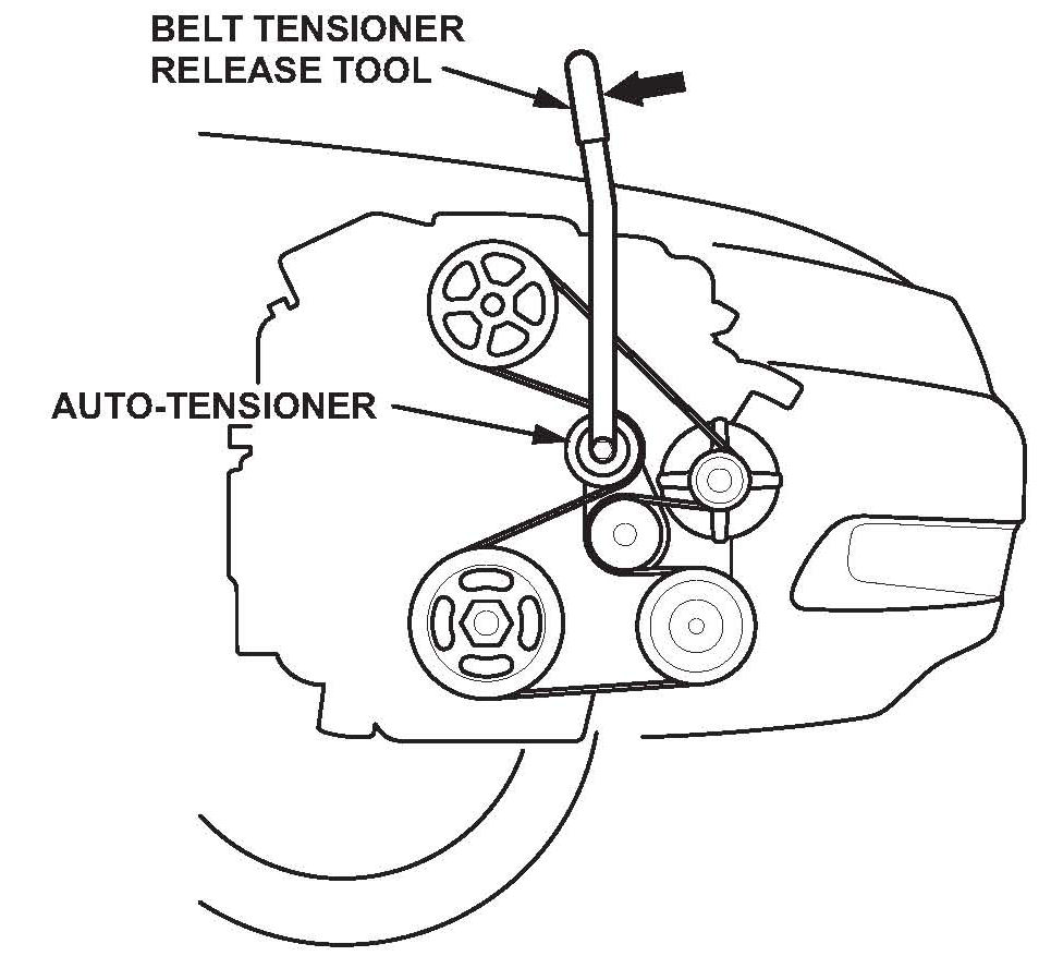 6. Using the belt tensioner release too, move the auto-tensioner in the direction of the solid arrow to relieve the tension on the drive belt, then remove the drive belt.
