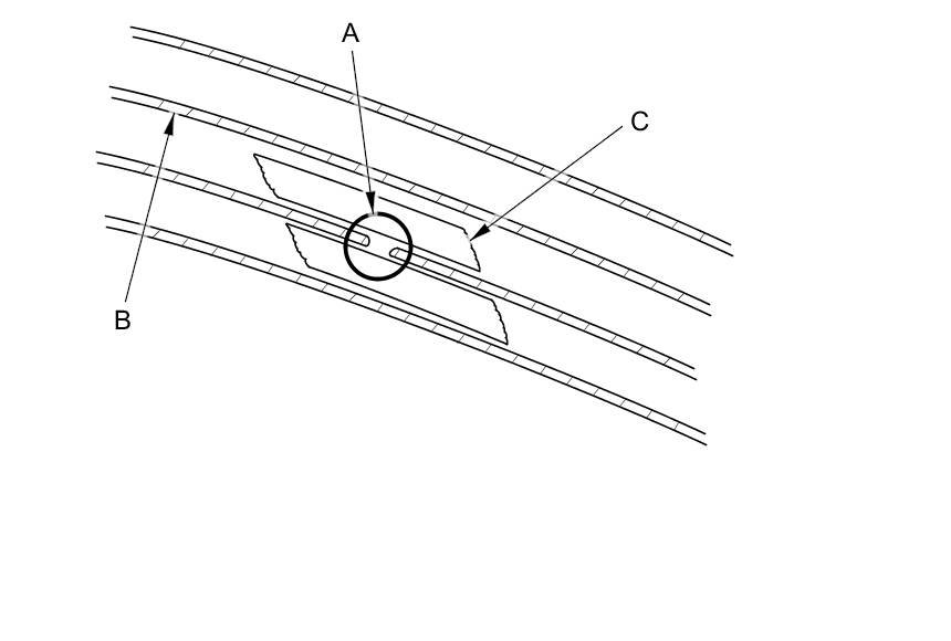 2. Carefully mask above and below the broken portion of the defogger wire (B) with cellophane tape (C).