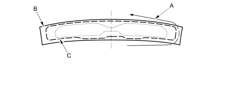 16. Pack adhesive into the cartridge without air pockets to ensure continuous delivery. Put the cartridge in a caulking gun, and run a bead of adhesive (A) along the edge of the front fixed glass panel (B) and the glass front gap seal (C) as shown or along the original adhesive path on the housing: