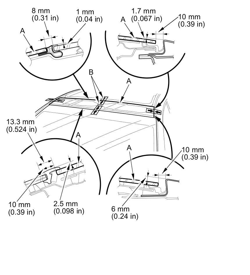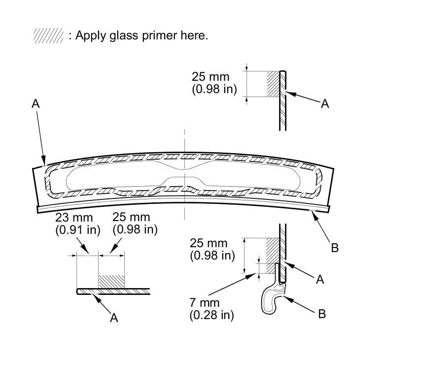 13. Apply a light coat of glass primer along the edge of the front fixed glass panel (A) and the glass front gap seal (B) as shown, then let the primer dry for at least 10 minutes: