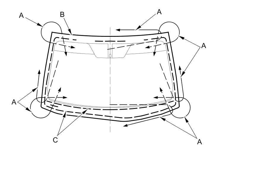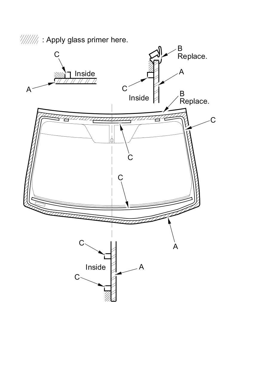 18. Apply a light coat of glass primer to the windshield (A) along the edge of the windshield upper molding (B) and the rubber dams (C) as shown, then lightly wipe it off with a gauze or a cheesecloth: