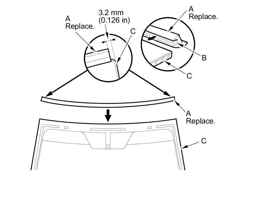 14. Attach the windshield upper molding (A) with adhesive tape (B) to the upper edge of the windshield (C). Be careful not to touch the windshield where the adhesive will be applied.