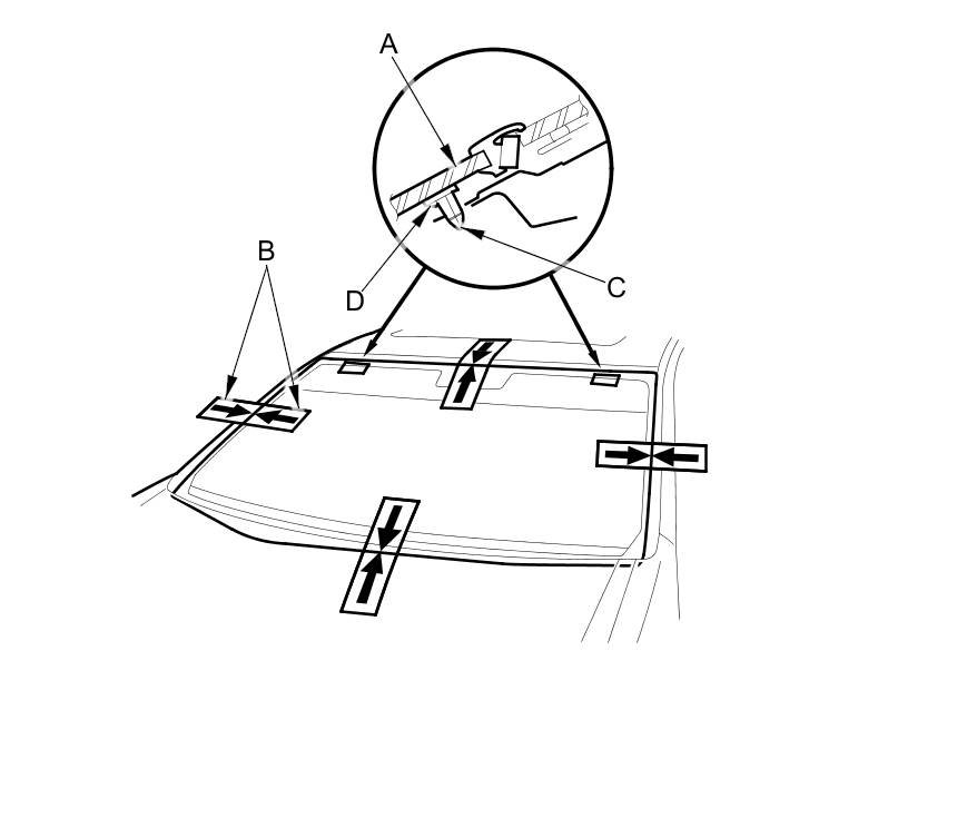 12. Apply glass primer to the upper clip mounting areas on the windshield (C), and let it dry. Remove the adhesive backing and attach the rubber dam A, B and the upper clips (D) to the inside of the windshield as shown:
